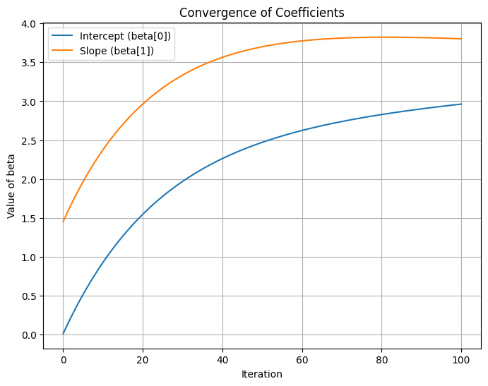 Iteration 99: beta = [2.95689684 3.8037924 ]