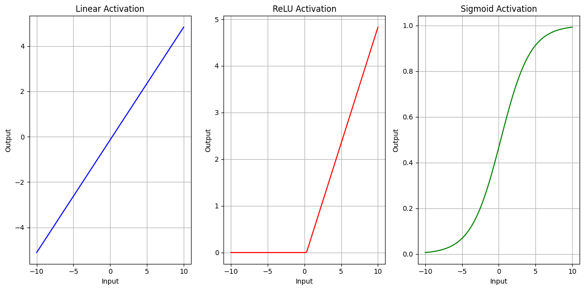 import numpy as npimport matplotlib.pyplot as plt# Generate synthetic datanp.random.seed(42)X = np.linspace(-10, 10, 100).reshape(-1, 1) # Input: 100 points from -10 to 10weights = np.random.randn(1, 1) # Random weightsbias = np.random.randn(1) # Random bias# Linear transformationlinear_output = X @ weights + bias# Activation functionsdef identity(x):return x # Linear (no activation)def relu(x):return np.maximum(0, x) # ReLUdef sigmoid(x):return1/ (1+ np.exp(-x)) # Sigmoid# Apply activation functionsoutput_identity = identity(linear_output)output_relu = relu(linear_output)output_sigmoid = sigmoid(linear_output)# Plot resultsplt.figure(figsize=(12, 6))# Plot the input-output relationship for each activation functionplt.subplot(1, 3, 1)plt.plot(X, output_identity, label="Linear Activation (Identity)", color="blue")plt.title("Linear Activation")plt.xlabel("Input")plt.ylabel("Output")plt.grid(True)plt.subplot(1, 3, 2)plt.plot(X, output_relu, label="ReLU Activation", color="red")plt.title("ReLU Activation")plt.xlabel("Input")plt.ylabel("Output")plt.grid(True)plt.subplot(1, 3, 3)plt.plot(X, output_sigmoid, label="Sigmoid Activation", color="green")plt.title("Sigmoid Activation")plt.xlabel("Input")plt.ylabel("Output")plt.grid(True)plt.tight_layout()plt.show()