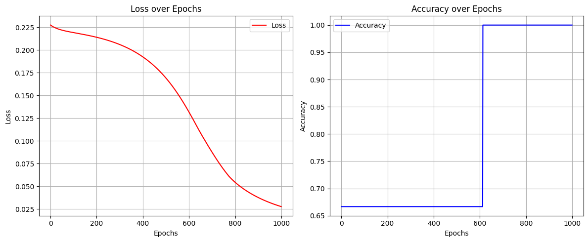 import torchimport torch.nn as nnimport torch.optim as optimimport matplotlib.pyplot as plt# Input data and true labelsX = torch.tensor([[0.5, 0.2], [0.1, 0.4], [0.6, 0.9]], dtype=torch.float32) # Shape (3 samples, 2 features)y = torch.tensor([[1], [0], [1]], dtype=torch.float32) # True labels (Shape: 3x1)# Define the neural networkclass SimpleNN(nn.Module):def__init__(self):super(SimpleNN, self).__init__()# Define layersself.hidden = nn.Linear(2, 3) # Input to hidden layer (2 inputs, 3 hidden nodes)self.output = nn.Linear(3, 1) # Hidden to output layer (3 hidden nodes, 1 output)def forward(self, x):# Forward pass: Input -> Hidden Layer -> Output Layer x = torch.relu(self.hidden(x)) # ReLU activation for hidden layer x = torch.sigmoid(self.output(x)) # Sigmoid activation for output layerreturn x# Initialize the networkmodel = SimpleNN()# Loss function and optimizercriterion = nn.MSELoss() # Mean Squared Error Lossoptimizer = optim.SGD(model.parameters(), lr=0.1) # Stochastic Gradient Descent optimizer# Training parametersepochs =1000# Containers to store loss and accuracy for each epochloss_history = []accuracy_history = []# Training loopfor epoch inrange(epochs):# Forward pass outputs = model(X) # Predicted outputs loss = criterion(outputs, y) # Compute loss# Compute accuracy predicted = (outputs >=0.5).float() # Threshold at 0.5 for binary classification accuracy = (predicted == y).sum().item() / y.size(0)# Backpropagation optimizer.zero_grad() # Clear previous gradients loss.backward() # Compute gradients optimizer.step() # Update weights# Record loss and accuracy loss_history.append(loss.item()) accuracy_history.append(accuracy)# Print loss every 100 epochsif epoch %100==0:print(f"Epoch {epoch}, Loss: {loss.item():.4f}")# Final predictionswith torch.no_grad(): # No need to compute gradients during inference final_outputs = model(X)print("\nFinal Predictions:")print(final_outputs)# Plot the loss and accuracy over epochsplt.figure(figsize=(12, 5))# Loss plotplt.subplot(1, 2, 1)plt.plot(range(epochs), loss_history, label="Loss", color="red")plt.xlabel("Epochs")plt.ylabel("Loss")plt.title("Loss over Epochs")plt.grid(True)plt.legend()# Accuracy plotplt.subplot(1, 2, 2)plt.plot(range(epochs), accuracy_history, label="Accuracy", color="blue")plt.xlabel("Epochs")plt.ylabel("Accuracy")plt.title("Accuracy over Epochs")plt.grid(True)plt.legend()plt.tight_layout()plt.show()