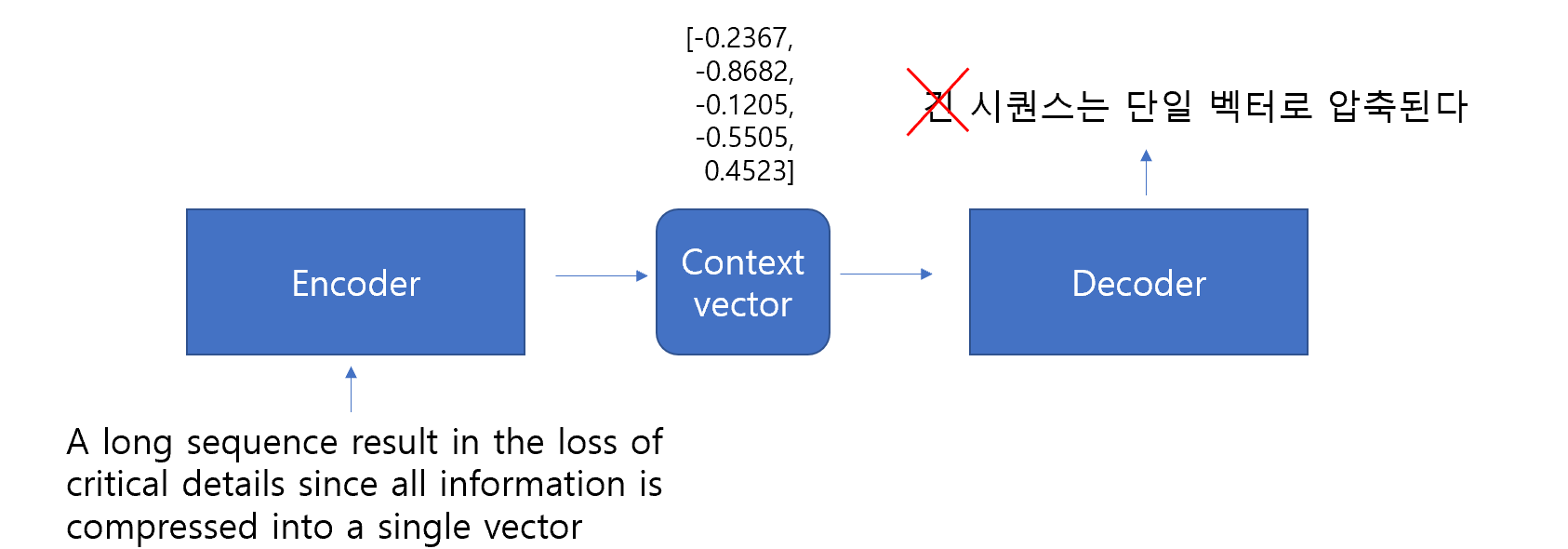Long input sequences result in the loss of critical details since all information is compressed into a single vector.
